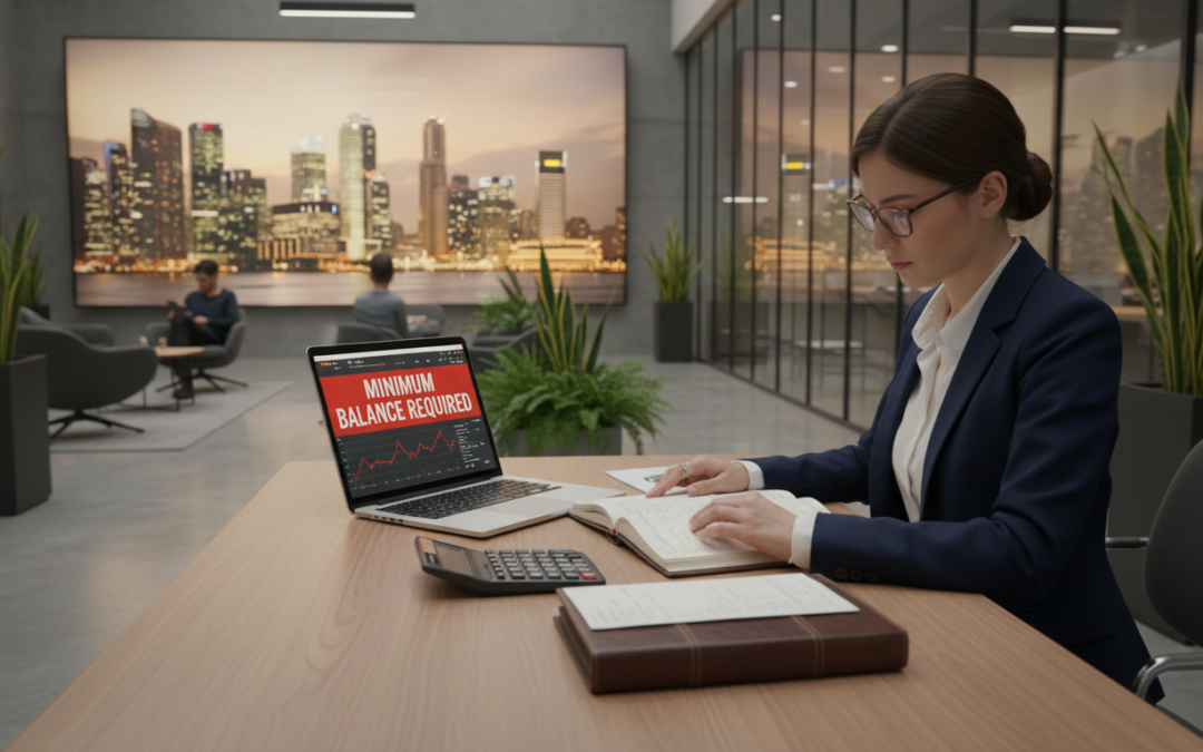 A photorealistic image depicting a bank setting focused on minimum balance concepts. In the foreground, a sleek, modern desk with an open ledger, calculator, and a laptop displaying financial data. A professional businessperson in a business suit, male or female, is thoughtfully examining the documents. In the middle ground, an elegant bank interior with glass walls and warm lighting, showcasing occasional plants to evoke a sense of calm and professionalism. The background features a subtle mural representing Singapore's skyline, emphasizing the local context. The lighting is soft but bright enough to create a welcoming atmosphere, with a slight depth of field to emphasize the foreground elements. The overall mood conveys diligence and clarity in financial management.