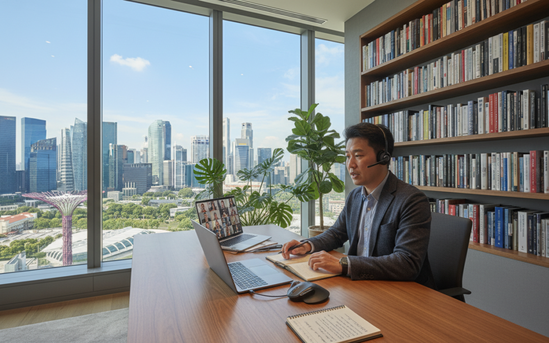 A modern office workspace designed for remote business operations, featuring a sleek desk with a high-end laptop, digital notepad, and wireless headset. The foreground showcases a professional individual in business casual attire, engaged in a video conference call, with a focused expression. In the middle, a large window allows natural light to flood the space, illuminating indoor plants and a neatly organized bookshelf filled with business literature. The background depicts a bustling urban skyline of Singapore, hinting at the company's locale. Soft lighting creates a warm, inviting atmosphere, while a wide-angle lens captures the full scope of the organized workspace, emphasizing productivity and modernity in a remote working setting.