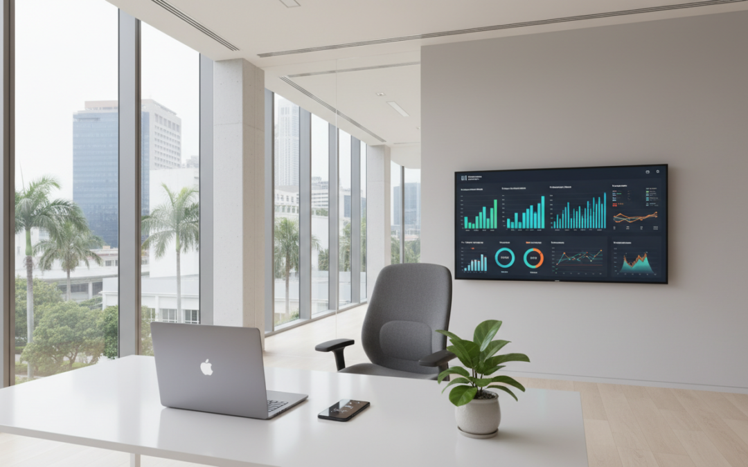 A modern virtual office workspace, designed for a digital entrepreneur in Singapore. In the foreground, a sleek desk with a high-end laptop, smartphone, and potted plant, conveying a sense of productivity. In the middle, a comfortable ergonomic chair and a wall-mounted screen displaying a digital dashboard filled with graphs and data. The background showcases a bright, airy room with large windows allowing natural light to stream in, emphasizing a clean, minimalist aesthetic. Soft, neutral color tones enhance the tranquil atmosphere, while the setting exudes a professional yet approachable mood. The lighting is bright and cheerful, captured with a wide-angle lens to give an expansive feel to the environment. Focus on creating a photorealistic scene that reflects the innovative and flexible nature of remote work in Singapore.