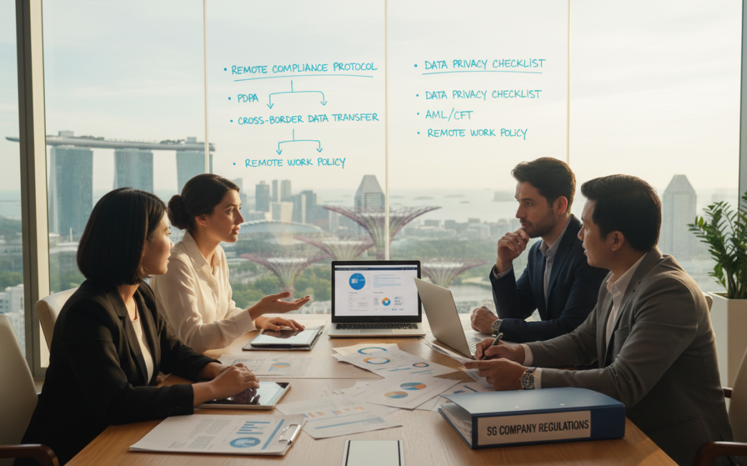 A photorealistic image depicting the key elements of legal compliance for remote business operations in Singapore. In the foreground, a diverse group of three professionals in smart business attire, discussing and reviewing legal documents on a modern office table filled with a laptop, a tablet, and various regulatory papers. The middle section includes a large, stylish whiteboard filled with flowcharts and compliance checklists, emphasizing key company policies. In the background, panoramic windows reveal Singapore's iconic skyline, bathed in soft daylight, creating an atmosphere of professionalism and focus. The lighting is bright yet warm, enhancing the sense of collaboration and forward-thinking in the remote work environment. The overall mood is one of diligence, integrity, and business acumen.
