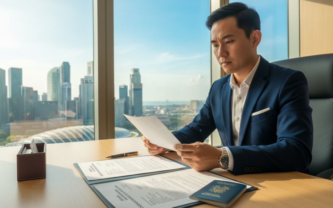 A photorealistic image depicting the key requirements for company registration in Singapore. In the foreground, a neatly arranged desk featuring documents such as forms, identification, and a pen, symbolizing the registration process. In the middle, a confident professional dressed in formal business attire reviews these documents, their expression focused and determined. In the background, a window reveals the iconic skyline of Singapore with modern skyscrapers under a bright, clear blue sky, enhancing the atmosphere of opportunity and ambition. Soft, natural lighting streams in, casting a warm glow over the scene, conveying an inviting and professional mood. The composition emphasizes clarity and professionalism, aligning with the theme of business setup.