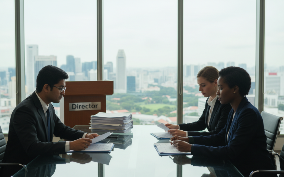A modern office conference room set up for a director appointment meeting. In the foreground, a diverse group of three professionals, a South Asian man, a Caucasian woman, and a Black woman, are seated around a sleek glass table, reviewing documents with focused expressions, dressed in well-fitted business attire. In the middle, an elegant wooden podium with a nameplate reading "Director" and a stack of corporate documents. In the background, large windows allow natural light to flood the space, revealing a bustling cityscape of Singapore. Soft, diffused lighting enhances the professional atmosphere, while a shallow depth of field blurs the busy background slightly, drawing attention to the subjects. Overall, the mood is collaborative and serious, reflecting the importance of their roles in the incorporation process.