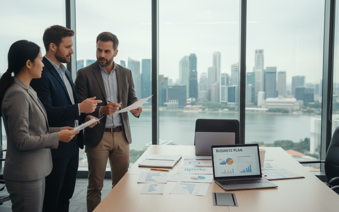 A dynamic office scene illustrating the concept of "ownership." In the foreground, a diverse group of three professional individuals in business attire (a Southeast Asian woman, a Caucasian man, and a South Asian man) stand confidently with documents and a laptop, symbolizing collaboration and decision-making. In the middle, a conference table with charts and a laptop displays a business plan, hinting at company registration processes. The background features a modern, well-lit office space with glass windows showcasing the Singapore skyline, reflecting ambition and growth. Soft, natural daylight streams in from the windows, creating an inviting atmosphere. The angle is slightly elevated, focusing on the professionals' engaged expressions, conveying determination and clarity.