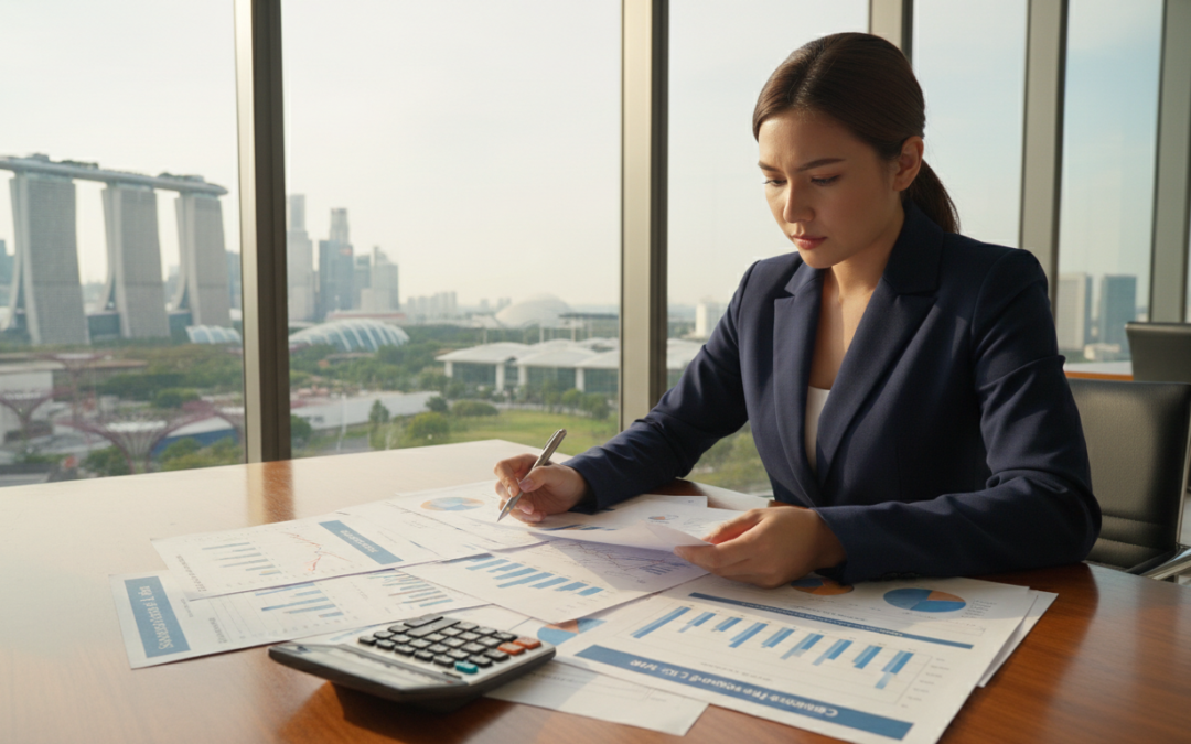 A photorealistic scene that visually represents the concept of "tax payable" in the context of corporate tax calculation in Singapore. In the foreground, a focused view of a calculator lying on a polished wooden desk, surrounded by financial documents with charts and graphs indicating growth, showing the corporate tax rate and current rebates calculations. In the middle ground, a professional businesswoman in business attire intently analyzing the figures, her face reflecting concentration. In the background, a modern office setting with large windows revealing a skyline of Singapore, bathed in soft, natural light to create an atmosphere of clarity and focus. The overall mood should convey diligence and professionalism, suitable for a tax-related discussion.