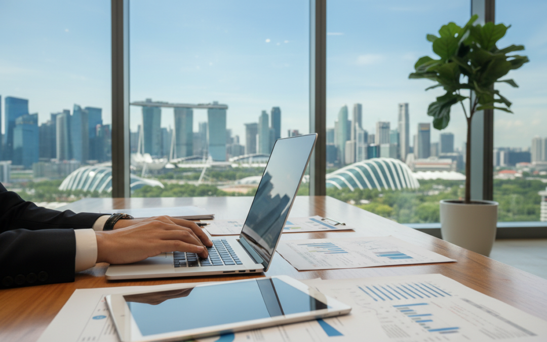 A sleek and modern office environment in Singapore, showcasing a professional workspace featuring a stylish desk with a laptop open on it and various business papers neatly arranged. In the foreground, include a pair of hands typing on the keyboard, dressed in business attire. The middle ground will have a large window revealing a vibrant cityscape of Singapore, with iconic skyscrapers in soft focus against a blue sky. In the background, a green potted plant adds a touch of nature, creating a calming atmosphere. The lighting is bright and natural, coming from the window, illuminating the workspace and enhancing the professional ambiance. Overall, the mood conveys professionalism, efficiency, and a welcoming environment aimed at business growth. Photorealistic details are essential for a high-quality image.