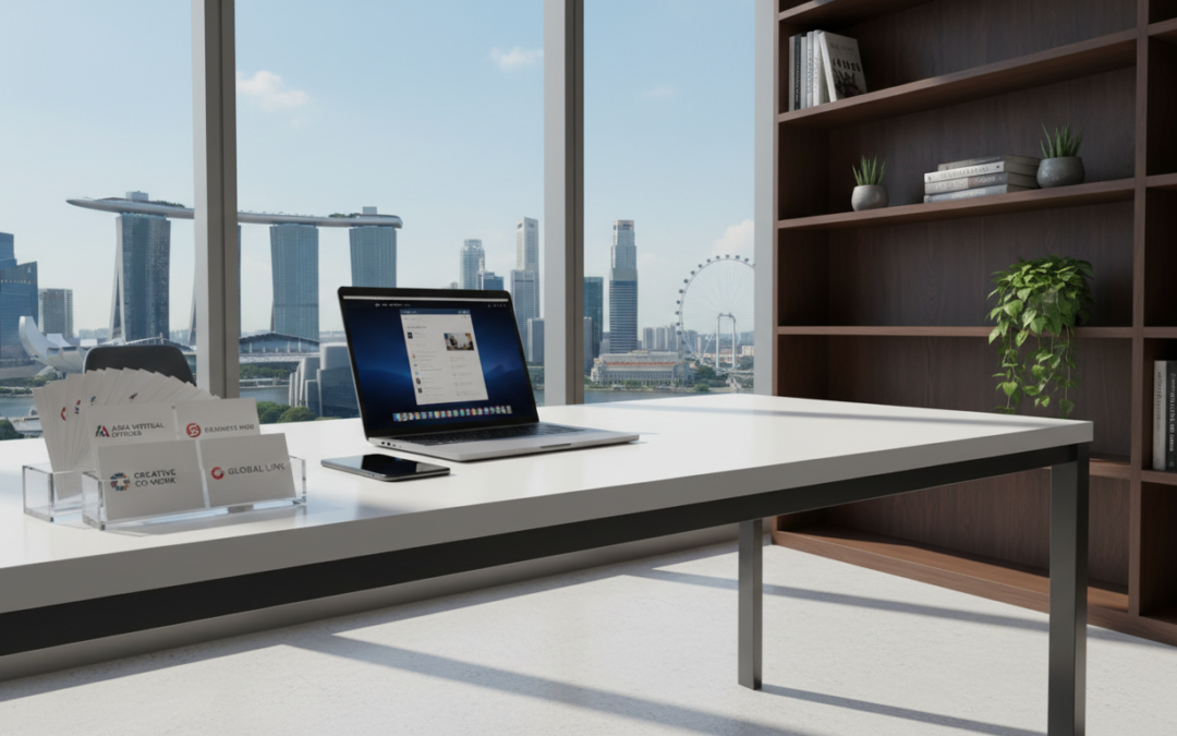 A sleek, modern virtual office setup in Singapore, showcasing a stylish desk with a high-end laptop and a smartphone. In the foreground, a neatly arranged business card holder, displaying various company names. The middle ground features a large window overlooking a vibrant city skyline, with iconic Singaporean architecture. In the background, a contemporary bookshelf filled with well-organized business books and decorative plants, creating an inviting yet professional atmosphere. Soft, natural lighting filters through the window, casting gentle shadows across the workspace. The overall mood is focused and inspiring, perfect for a business environment, emphasizing organization and professionalism, suitable for different business types considering a virtual office address.