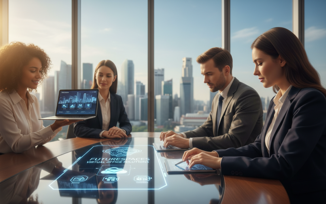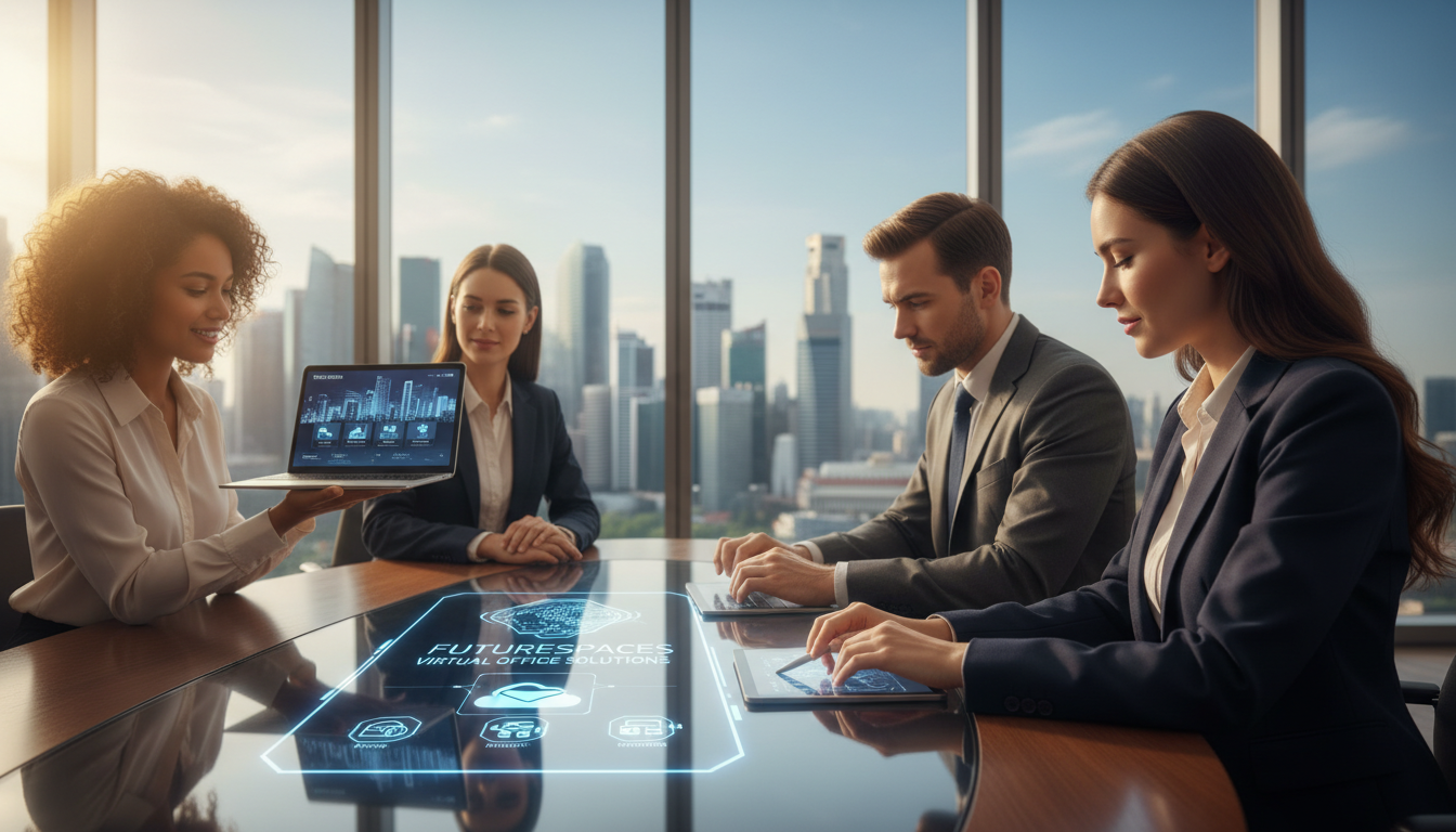 A modern office environment depicting a diverse group of professionals in business attire, gathered around a sleek conference table. In the foreground, a woman with long dark hair highlights a virtual office service brochure, pointing to key features. Beside her, a man in a suit takes notes on a digital tablet, while another professional, a woman with curly hair, displays a laptop showing virtual office options. The middle ground features a large window showcasing the iconic Singapore skyline, adding to the atmosphere of opportunity and innovation. The lighting is bright and natural, suggesting a productive, optimistic mood. Soft focus on the background enhances the professionals' engagement and emphasizes their collaboration in choosing the right virtual office service provider. Photorealistic rendering captures the details of their attire and expressions.